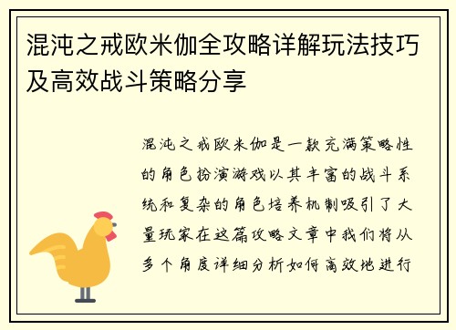 混沌之戒欧米伽全攻略详解玩法技巧及高效战斗策略分享